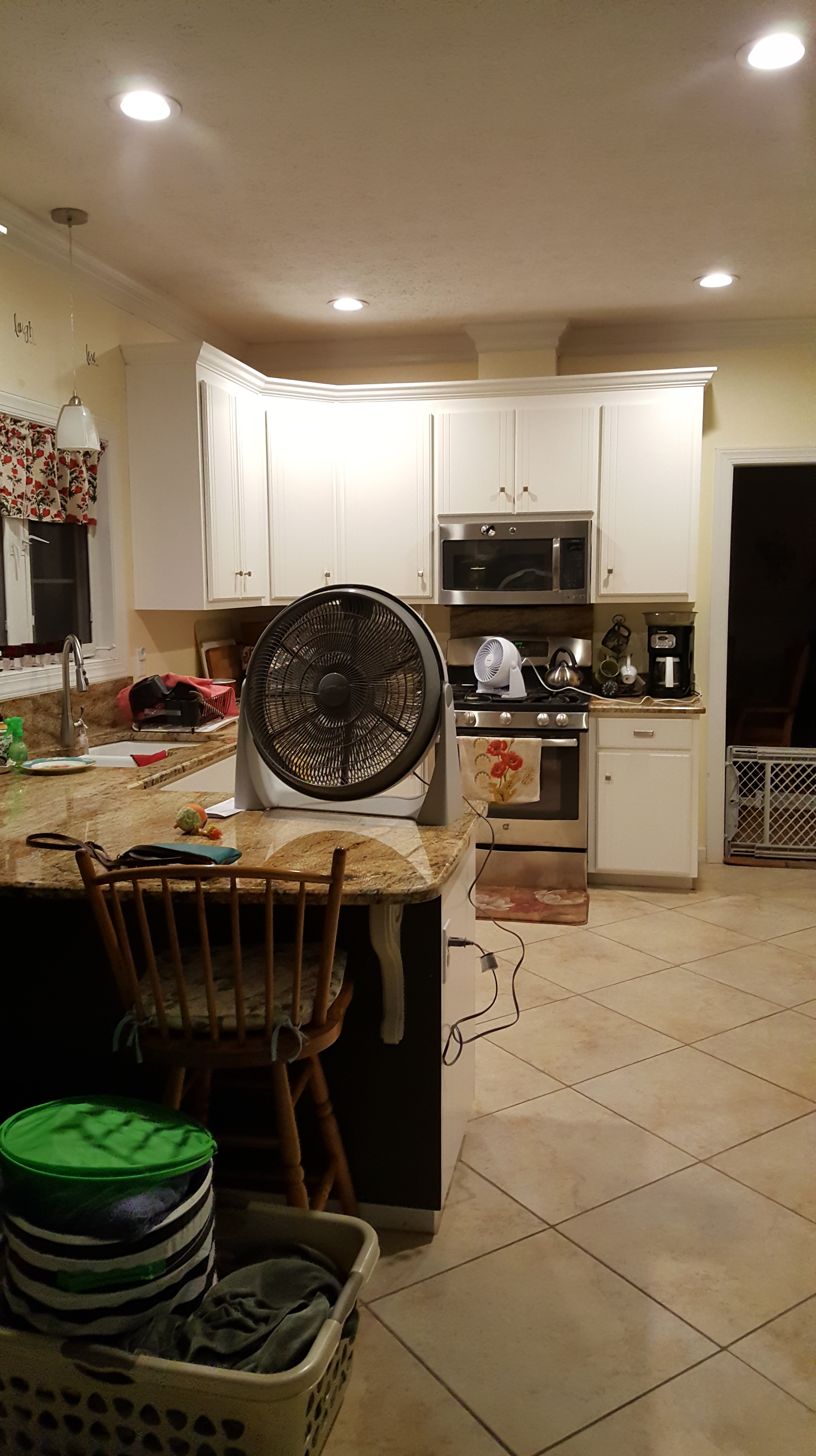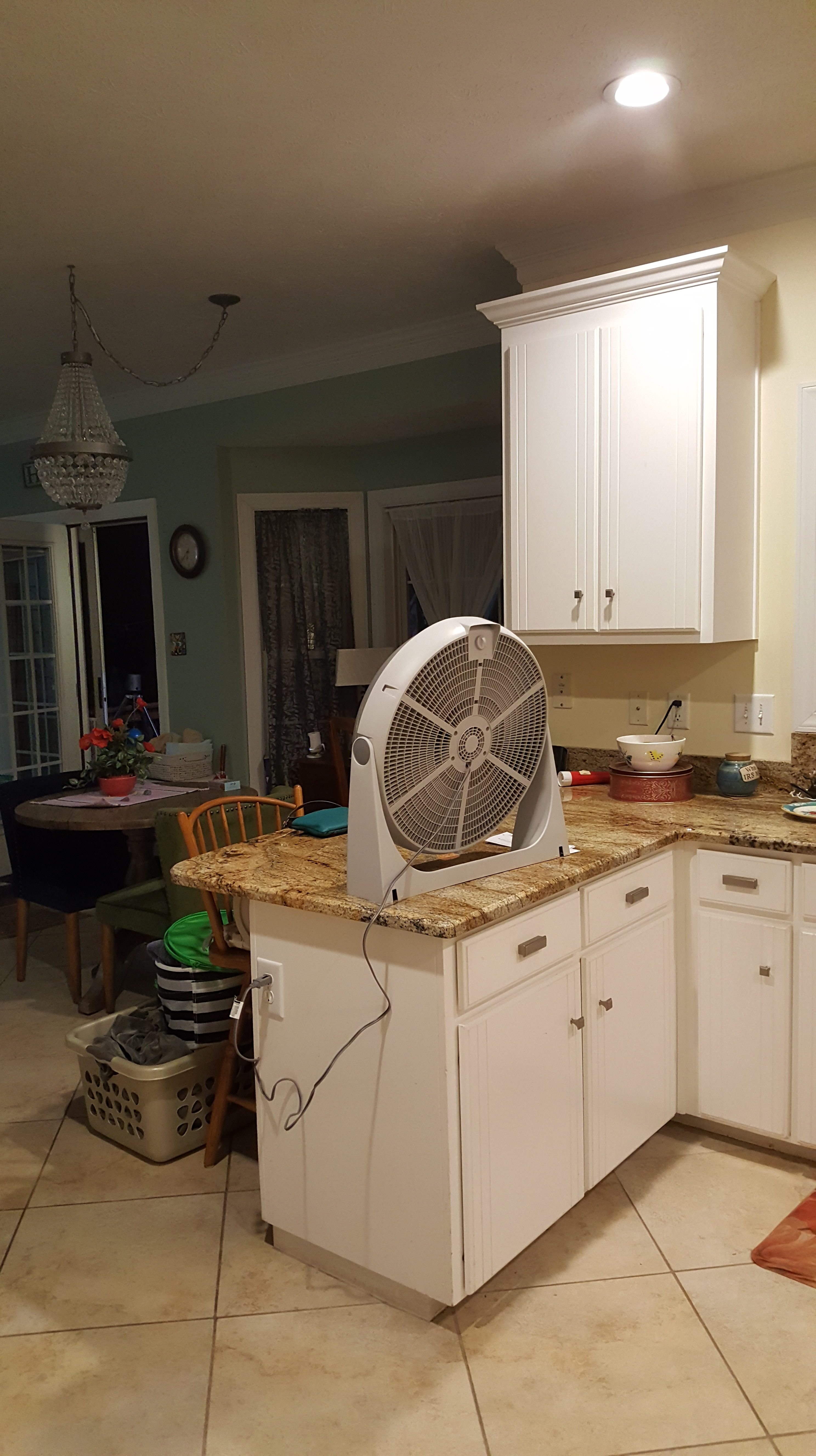 I put a small table-top fan on the stove to help direct the exhaust out the kitchen window. That didn’t do enough, so I set a floor fan on top of the counter to blow the smoke out the back door.