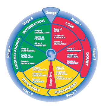 The Change Cycle is a real thing. It is a 6-stage model for responding to changes that go on all the time. For each stage, the model identifies probable feelings, thoughts, and behaviors. It looks like this.
