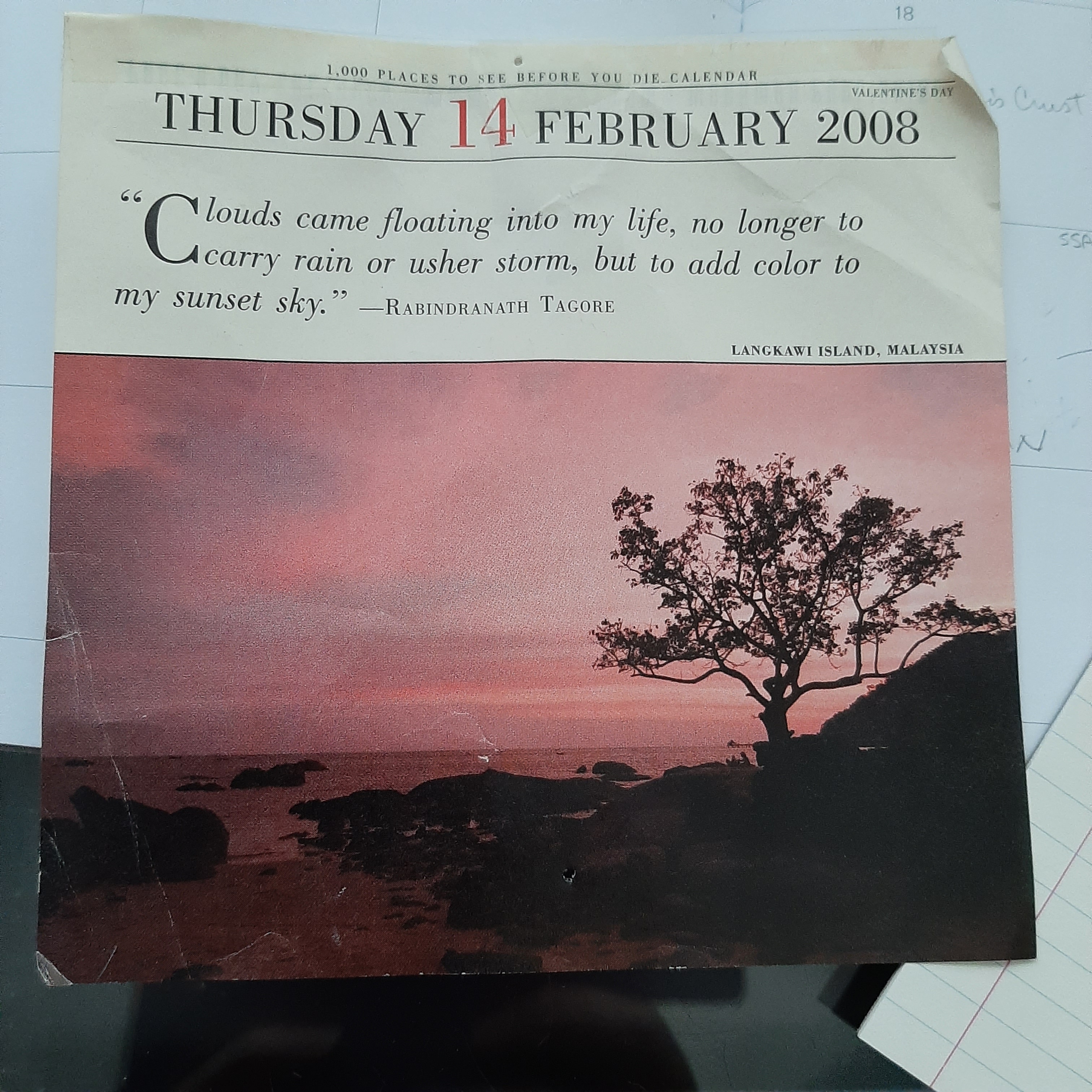 In the meantime, I think it is so perfect that this amazing life is mine. It is full of joyful delights, where I can build bigger, better dreams, and still have adventures even by myself. It is not what I would have asked for years ago, but I am getting quite comfortable with how it is all turning out. My thought for the day is from a calendar page from February 14, 2008 – long before I could ever imagine how much change I could endure.. or seek .. or anticipate.