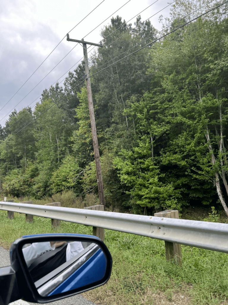 It was a decent day, somewhat cloudy, but warm. Although we have both had schedules that were littered with various appointments and errands lately, we found we had a block of time where we were both open. So in a mid-morning phone conversation when I was still in my nightie, we decided to quickly get decent, go for a drive, and find a new spot for lunch. I wore a t-shirt with sleeves so the sun wouldn’t burn my shoulders, and she had on a sweater. It was damp from humidity, making a drive with the top down cooler than the thermometer might tease you with. This is important to note because the eagle wouldn’t have been awestruck at my normally milky white shoulders, but maybe the white t-shirt was still potentially appealing to him.