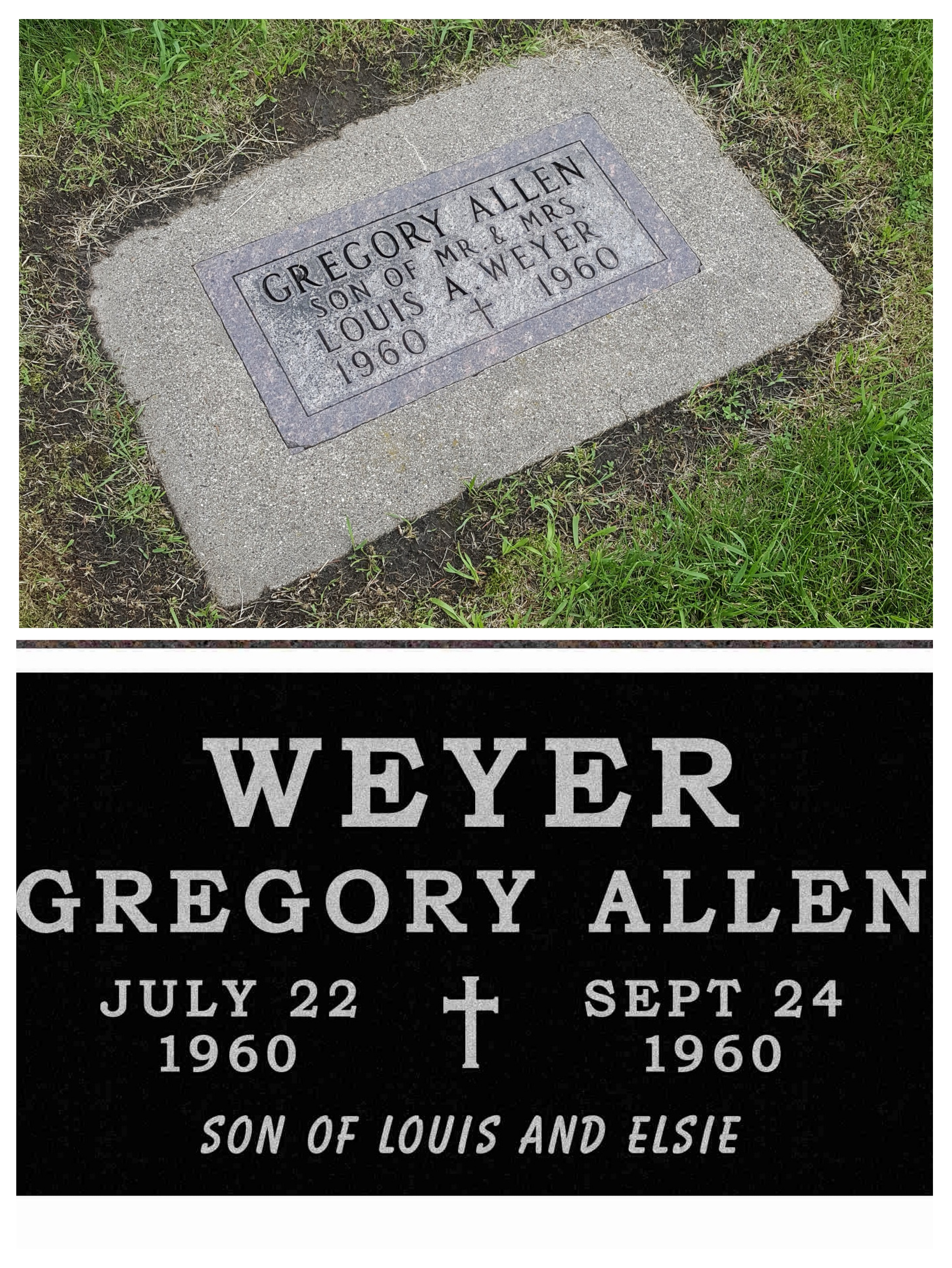 Greg’s footstone has his name prominently displayed, followed by an equally prominent declaration that he was the son of Mr. and Mrs. LOUIS A WEYER. And then 1960-1960. Ever since I can remember, that stone has irked me. It just never felt right. Even though I was brought up in the same way as all my cousins and my friends were, meaning No Questions Asked, no explanations necessary, he includes she, and the men were the absolute head of the family. I wondered about that stone a lot over the years.